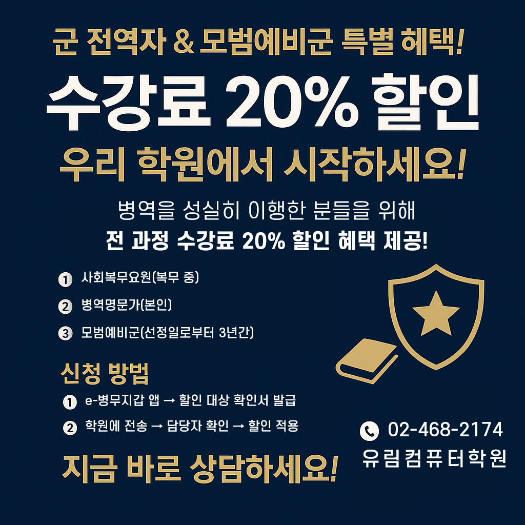 유림컴퓨터학원 | 문의 : 02-468-2174 | 대표이메일 : yulim2017@naver.com | 약도
