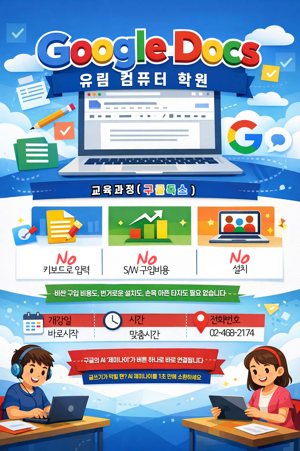 성수동 유림컴퓨터학원 교육과정 : 프로그램 구매 0원, 설치 0초! 구글 독스 & AI 활용 4주 완성반